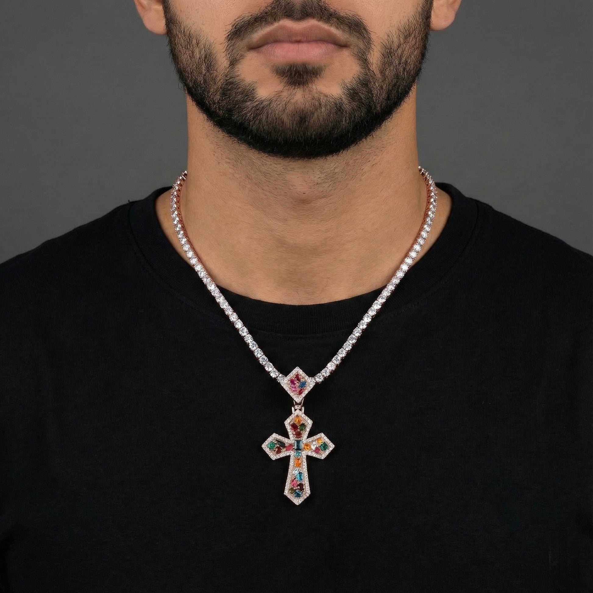 A bold fusion of structure and refinement, the unique mosaic multi coloured cross pendant is crafted for those who value creativity. Each meticulously set stone forms an unbroken stream of brilliance, amplifying the chain’s powerful silhouette. Handcrafted in London, this chain is not just jewellery - it is a statement of dominance.